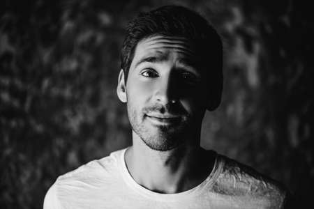 Portrait of a handsome smiling young man wearing white t-shirt. Studio shot over dark background. Men's beauty and health.