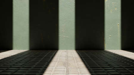 Close up view of prison bars with sunlight streaming through, creating dramatic contrast between light and shadow. scene evokes feelings of confinement and hope