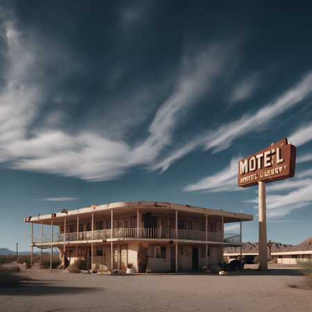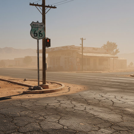 Vintage gas station sign with Gasoline 247 in faded red letters rustic pumps and open desert highway
