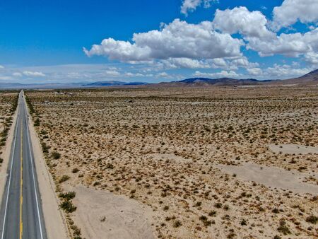 Aerial view of endless desert straight dusty asphalt road in Joshua Tree Park. USA. Long straight tarmac road heading into the desert to the direction of Arizona.