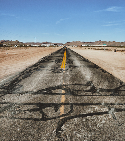 The damaged road 66 in the desert in Arizona on a bright and hot day.