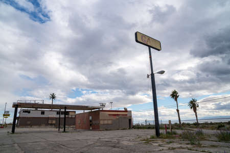 North Shore, California - March 21, 2019: Abandoned gas station left to decay in the desert, along highway 111 near the Salton Sea