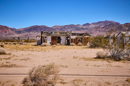 Abandoned Desert Building With Collapsed Roof And Mountain Range Under Blue Sky