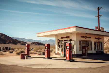 Lonely gas station in the arid desert. Cars filling up under the scorching sun., generative AI