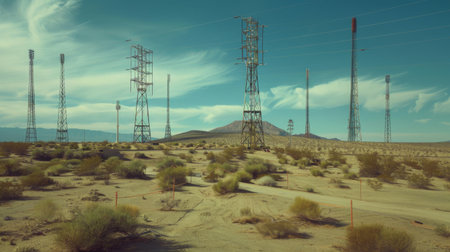 telephone poles stand tall against the barren desert backdrop, reminiscent of jessica drossin's urban landscape scenes. the light brown and cyan tones add a touch of artistic flair, while the grainy film effect enhances the desolate landscapes. this image captures the essence of nicolas bruno's style, with a hint of cryengine inspiration. ai generated