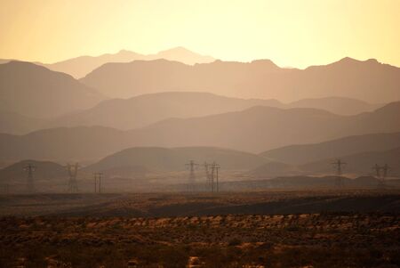 Coachella Valley California Desert Highway with High Voltage Electric Poles Along and San Bernardino Mountains. United States of America.
