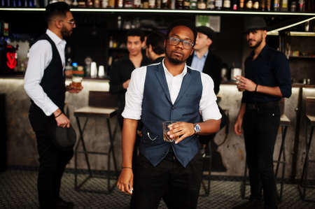 Stylish african american man against group of handsome retro well-dressed guys gangsters spend time at club, drinking on bar counter. Multiethnic male bachelor mafia party in restaurant.