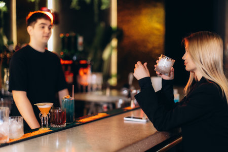 Friendly atmosphere at a modern bar with a young woman enjoying her drink while interacting with the bartender amid warm lighting and stylish decor.