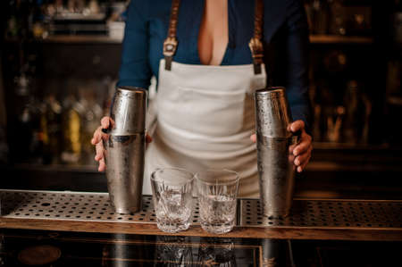 Female bartender in the white apron holding in her hands two steel cocktail shakers standing at the bar counter