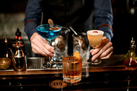 Barman pouring strong and elegant summer Arnaud cocktail into the glasses on the bar counter