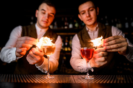 glasses with drinks stands on bar and professional bartenders sprinkle and set them on fire