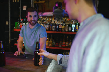Handsome businessmen in bar are drinking beer and communicating with cheerful bartender.