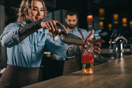Barman woman with deep neckline stirring cocktail with ice in a glass on the bar counter