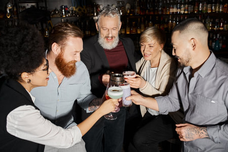 joyful and successful multiethnic business team clinking glasses while spending time in cocktail bar