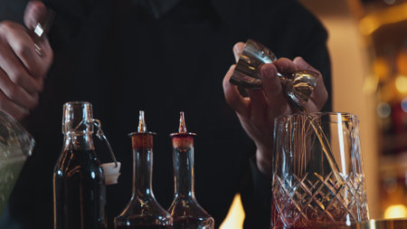 Closeup hand bartender holding jigger to measure liquor sugar into mixing glass ingredients alcohol preparation creative mixed cocktail. Special refresh drink showcasing nightlife mixology. Vinosity.