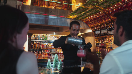 Barman in a brown leather apron pouring alcoholic cocktail into the glass standing behind the bar counter