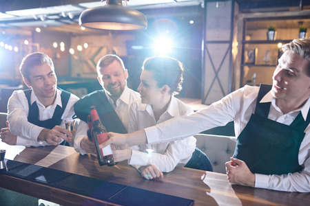 handsome cheerful barman drinking coffee and speaking with colleagues at workplace