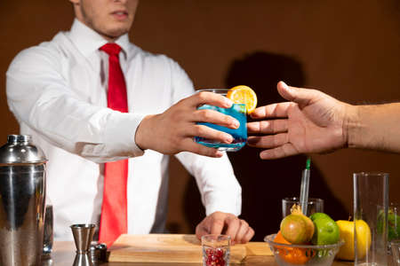 Bartender serving alcoholic drink to a client at the bar. Dramatic lights