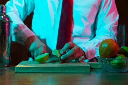 Close up of professional barman finishes preparation of alcoholic cocktail in multicolored neon light