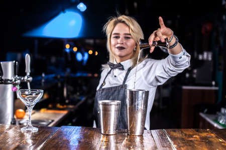 Confident Female bartender adds ingredients to a cocktail in the pub