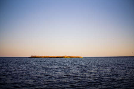 Out to sea framed by reeds. Small waves on the water during sunset. Clear sky.