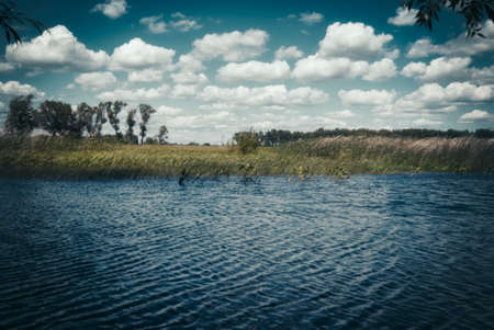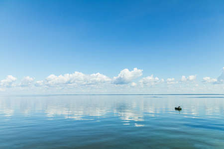 Amazing beautiful blue sky with light white clouds over calm smooth river surface. Summertime. Sunny day.