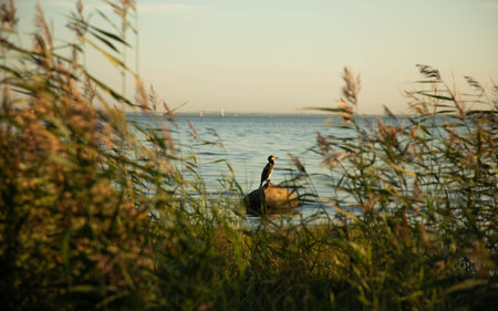 Cormorant on the shore of a lake at sunset.