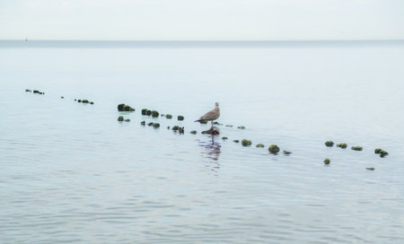 Seagull birds sit on a long stone pier at sea and blue sky. Pacific sea without waves