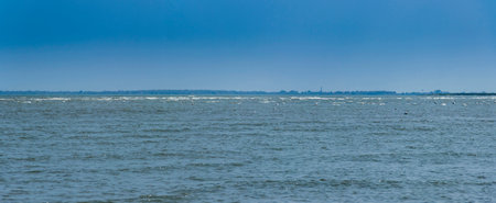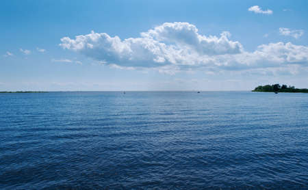 big blue surface of the water with ripples and the line of the horizon with the cloudy sky for a natural background