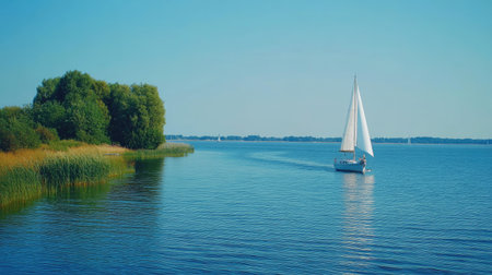 A serene scene of a sailboat participating in a regatta on the Baltic Sea, showcasing the beauty of sailing on a clear summer day. Enjoy the peaceful waters and lush greenery.