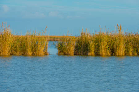 Reed along the edge of a lake in wetland under a blue cloudy sky in sunlight in autumn