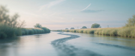 a captivating sunrise scene unfolds over marshall sound, showcasing a beautiful sky and reeds. the light turquoise and dark beige hues create a mesmerizing ambiance. this dutch landscape, reminiscent of the southern countryside, is a perfect example of nature-inspired imagery. the visual storytelling, with its narrative-driven approach and analogue filmmaking style, transports viewers to a captivating harbor with stunning views. ai generated