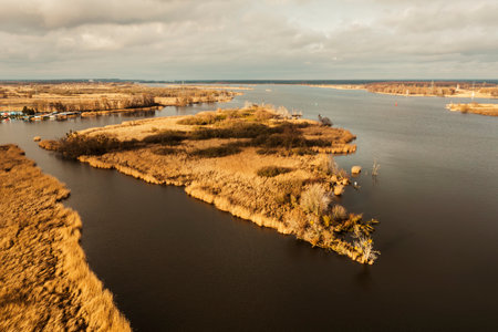 aerial shot of marshy land near rivers in nasuane province, captured in the style of dark beige and light amber tones. the serene atmospheric perspective of this kodak ektar 100 photograph showcases the coastal scenery. this tabletop photography image, shot in 32k uhd, beautifully captures the essence of landscape photography. ai generated