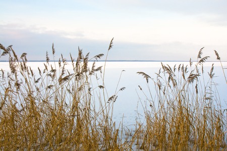 Brown reed at frozen, snow-covered lakeshore