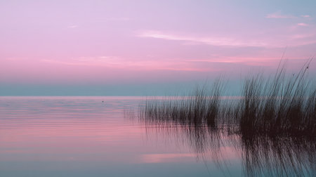 Experience the calm of a tranquil lake at dusk, where pastel skies meet still waters and reeds create a peaceful reflection, perfect for nature enthusiasts.