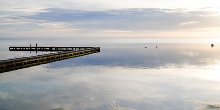 wooden pontoon lake sunrise Biscarosse beach in web banner template header