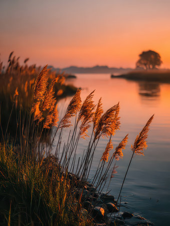 Experience the tranquility of a calm sunset over water, framed by golden reeds. The serene landscape showcases warm tones and peaceful reflections, inviting relaxation.