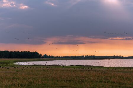 Population of wild geese at scenic Guelper See (Havelaue) in Brandenburg, Germany at sunset