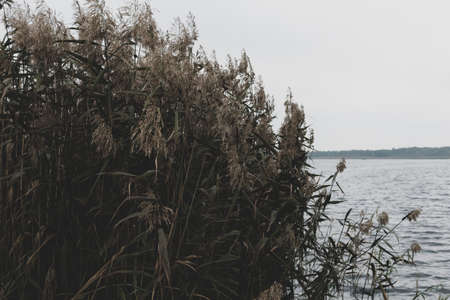Autumn landscape on the lake. Reeds growing on the shore and stones on the shore