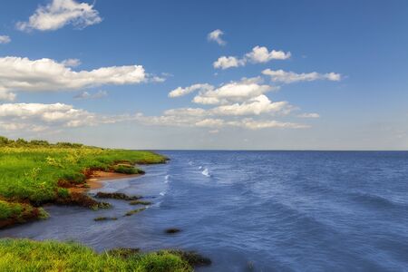 The shore of a large lake, against a background of blue sky and white clouds