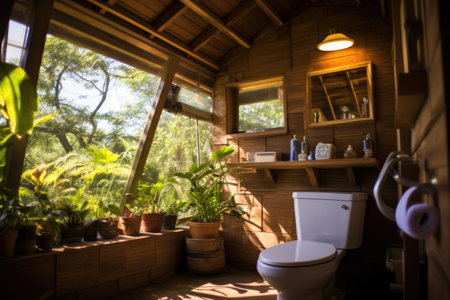 Stylish bathroom interior with toilet bowl and many beautiful houseplants. By generative Ai