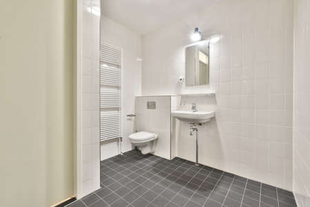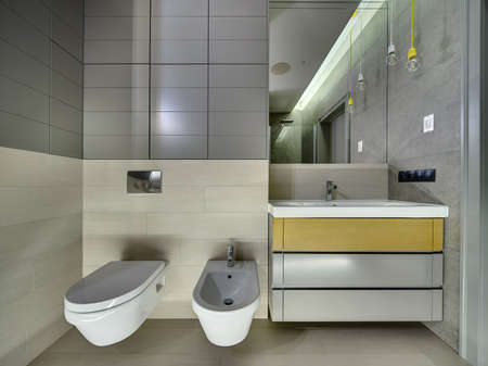 Modern bathroom with tiles on the walls and floor. There is a sink with a faucet and lockers, mirror, white toilet and a bide, hanging lamps, door, shower. Backlight glows from above. Horizontal.