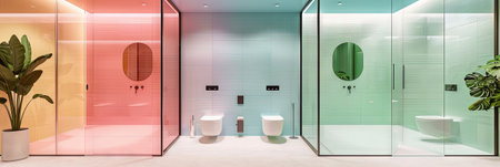 Public restroom interior with multiple toilets and green plants. Tiled bathroom design with natural light from window. Interior design concept for posters, print, and banner