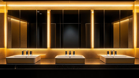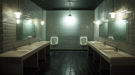 Pristine public restroom featuring clean, white sinks and vibrant blue-tiled walls and floors. the space is well-lit with an array of overhead lights, accentuating the modern and hygienic atmosphere. ideal for illustrating contemporary restroom designs. Generative AI