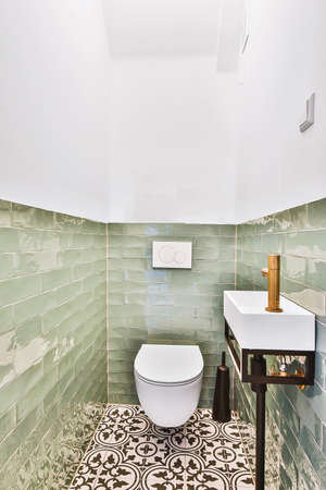 A small yet modern restroom showcases a sleek toilet setup against vibrant green tiles and elegant patterned flooring, creating a unique ambiance.