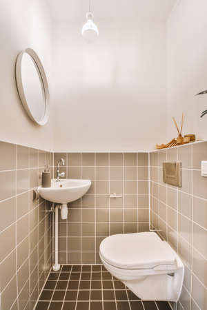 Russia, Moscow- July 21, 2019: interior room apartment. standard repair decoration in hostel. modern bathroom, sink, decoration elements, toilet