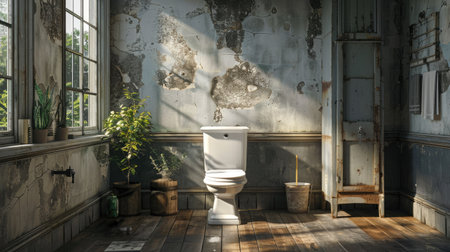 Rustic Bathroom with Vintage Toilet and Plants in Sunlight