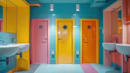 Public toilet, restroom, lavatory doors, baby changing table , bath shower . AI Generated.