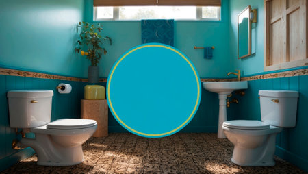 A vibrant bathroom scene featuring teal tiles and a classic toilet, showcasing modern design elements for interior inspiration.