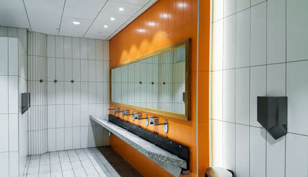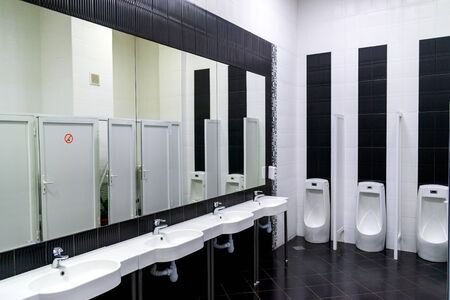 Interior of bathroom with sink basin faucet lined up and public toilet urinals, Modern design.